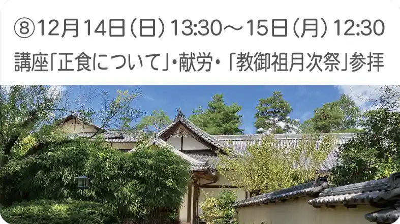 大道場特別講座 大本の聖地・霊場での体験とみ教えを通して、心の安らぎと明日のエネルギーを! どなたでも(信徒ならびに一般の方)受講していただけますので、お気軽にお申し込みください。●開催地:亀岡市天恩郷・神教殿他 ※③以外の講座は1日のみの参加も可能です。 ●参加費:各1,000円(宿泊・食費は別途)※③は交通費(マイクロバス)と現地での宿泊・食費が別途必要。●お問合せ・お申込先:大本大道場 TEL:0771-56-9081 メール:daidojo@oomoto.or.jp
